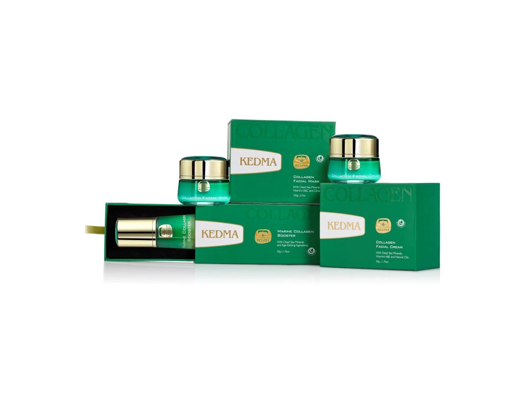 Kolagenová řada Kedma podporuje zdravou pleť a pomáhá jí vypadat pevně a pružně. Kombinace boosteru, krému a masky poskytuje nejlepší výsledky, protože jsou navrženy tak, aby spolupracovaly a vzájemně se doplňovaly. Tato sada přináší v elegantní krabičce celou řadu Kedma Collagen Collection proti stárnutí pleti. Sada obsahuje: Marine Collagen Booster, Collagen Facial Mask, Collagen Facial Cream, Collagen Neck & Décolleté Cream.