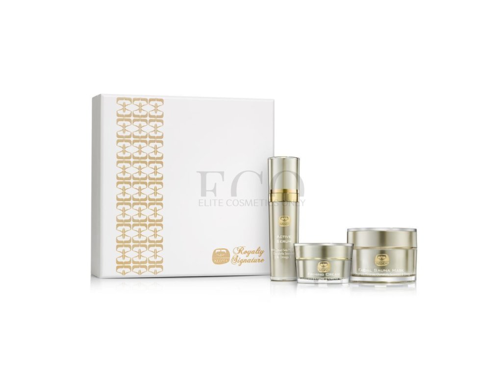 Detoxikační řada pro všechny typy pleti s minerály z Mrtvého moře, které pleť vyživují a zklidňují. Obsahuje peptid, který zvyšuje produkci kolagenu a navrací pleti jemnost a pružnost. Vypíná pleť a odstraňuje výskyt linek a vrásek. Sada Kedma Royalty Signature přináší celou řadu královských kolekcí v elegantní krabičce. Sada obsahuje: Royalty Sauna Mask, Royalty Active Serum, Royalty Firming Cream